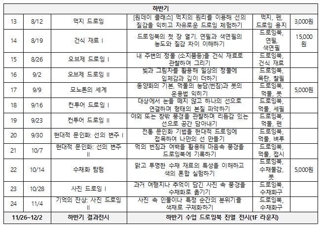○ 안내사항 - 본 프로그램 커리큘럼은 상반기와 하반기가 동일합니다. - 본 수업은 1회차당 선택 수업도 가능합니다.(1회당 5,000원) - 재료비는 강사에게 별도 납부해야 합니다.