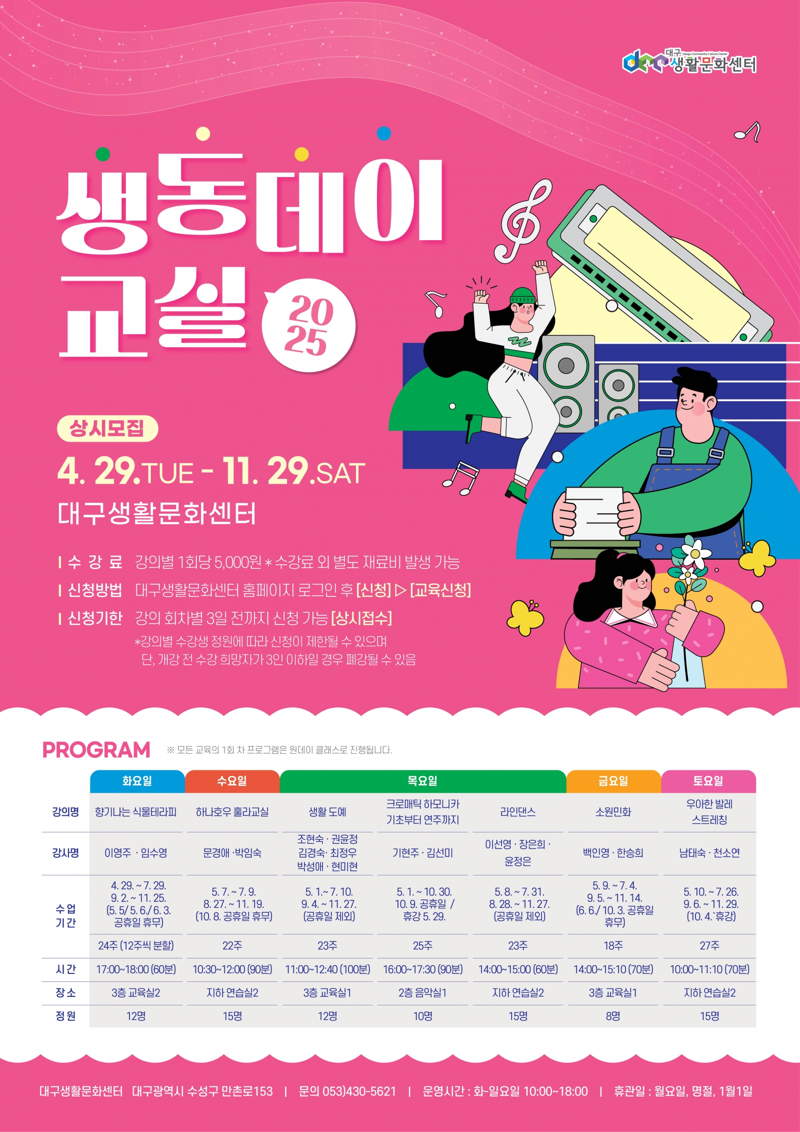 올해 초 2025 생동데이교실 공모를 통해 식물테라피, 훌라교실, 생활도예, 하모니카 연주, 라인댄스, 민화 그리기, 발레핏 스트레칭 등 7개 생동지기를 선정하고,
