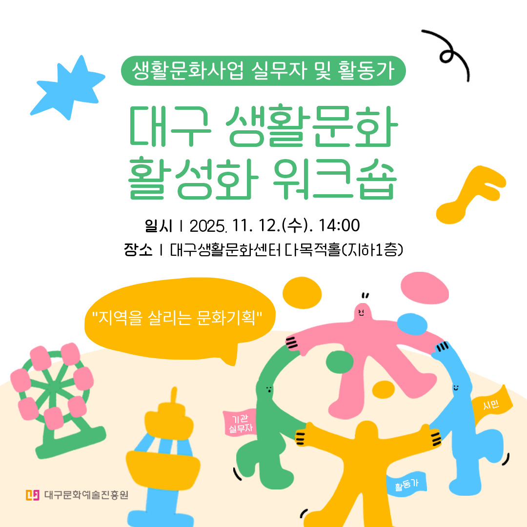 | 읽는중 | 제10회 대구 생활문화 활성화 워크숍 안내 2025.11.11 | 관리자 | 2025.11.11 | 158 |