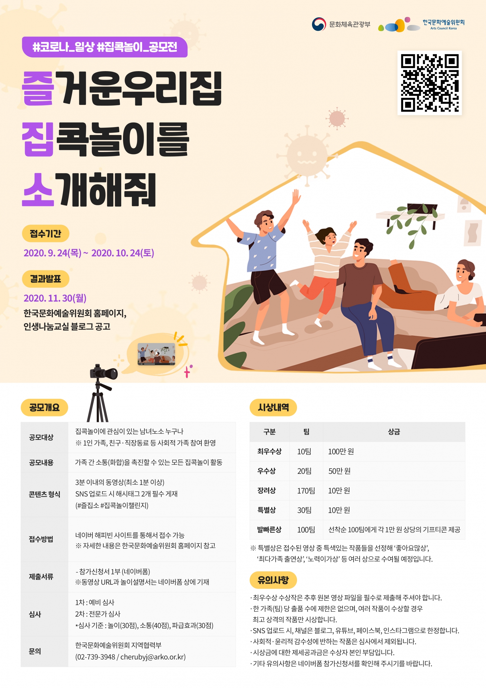 문화체육관광부와 한국문화예술위원회가 진행하는 "코로나 일상 집콕놀이 공모전-즐거운 우리집 집콕놀이를 소개해줘"를 안내합니다.