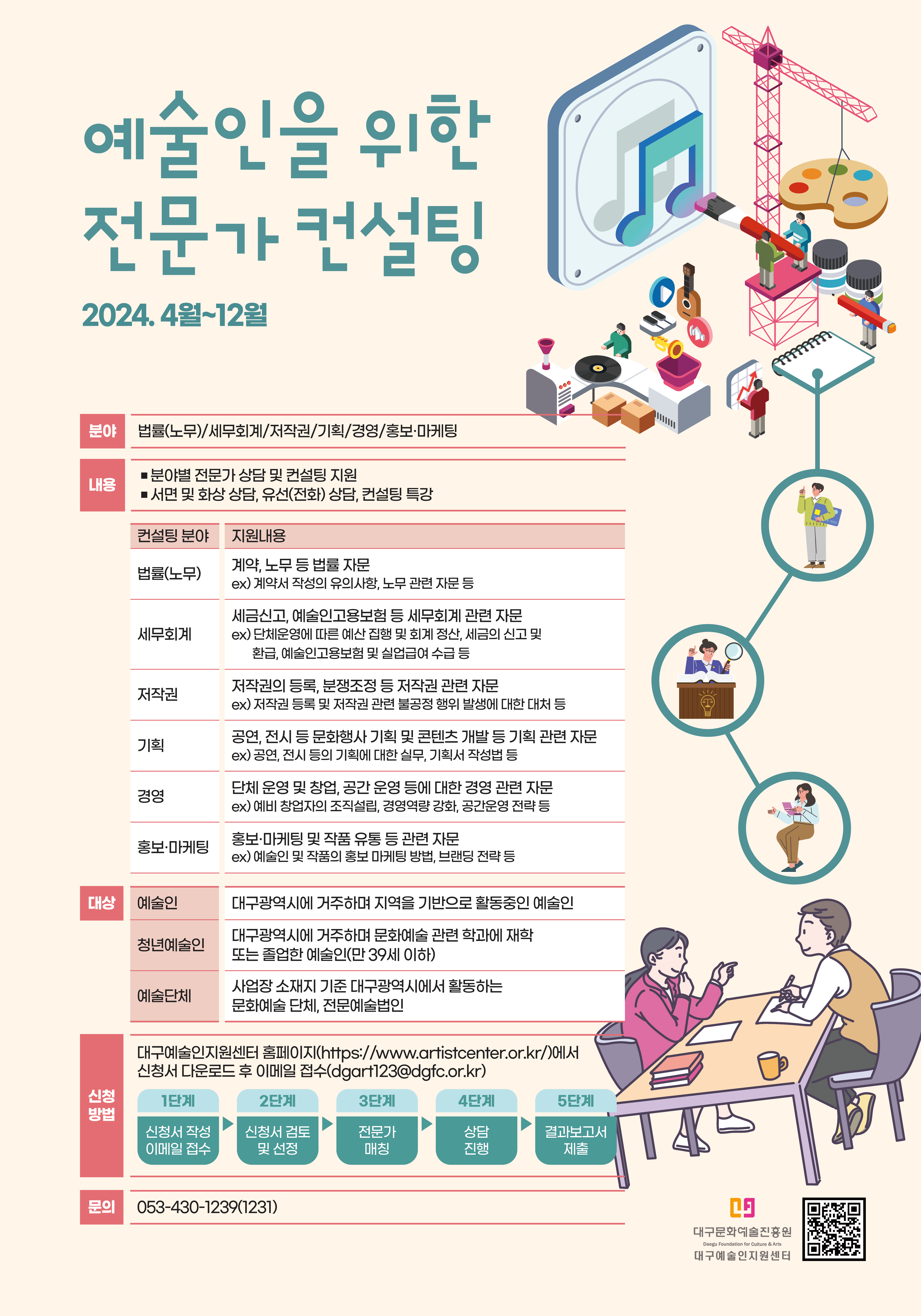 (재)대구문화예술진흥원에서는 실효적 창작활동 지원 및 지역사회 문화예술 경쟁력 향상과 예술인 역량강화를 위한 전문가 컨설팅 지원사업을 운영하오니 관심있는 분들의 많은 참여 바랍니다. 2024년 3월 12일 (재)대구문화예술진흥원장 |